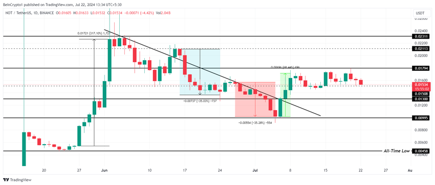 Notcoinin hinta on tällä hetkellä konsolidoitu 0,017–0,015 dollarin välille, ja useat yritykset murtaa vastus ovat epäonnistuneet. Altcoin lähes putosi 0,015 dollarin tukilinjan alapuolelle, mutta toipui nopeasti.