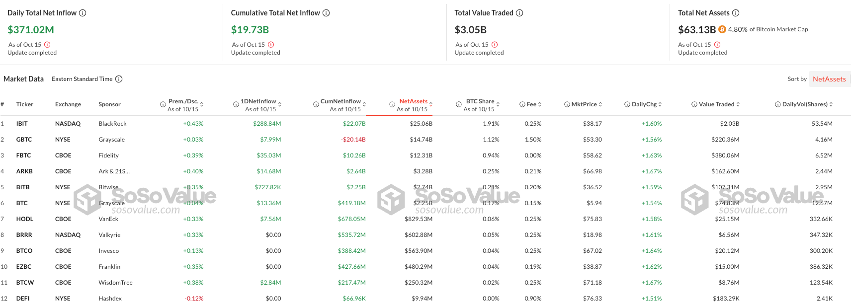 Sinä päivänä, kun Tesla siirsi Bitcoininsa, spot Bitcoin ETF:t kirjasivat sijoituksia yhteensä 371 miljoonaa dollaria. Pelkästään BlackRockin iShares Bitcoin Trust keräsi 288,84 miljoonaa dollaria, mikä osoittaa vahvaa sijoittajien kiinnostusta.