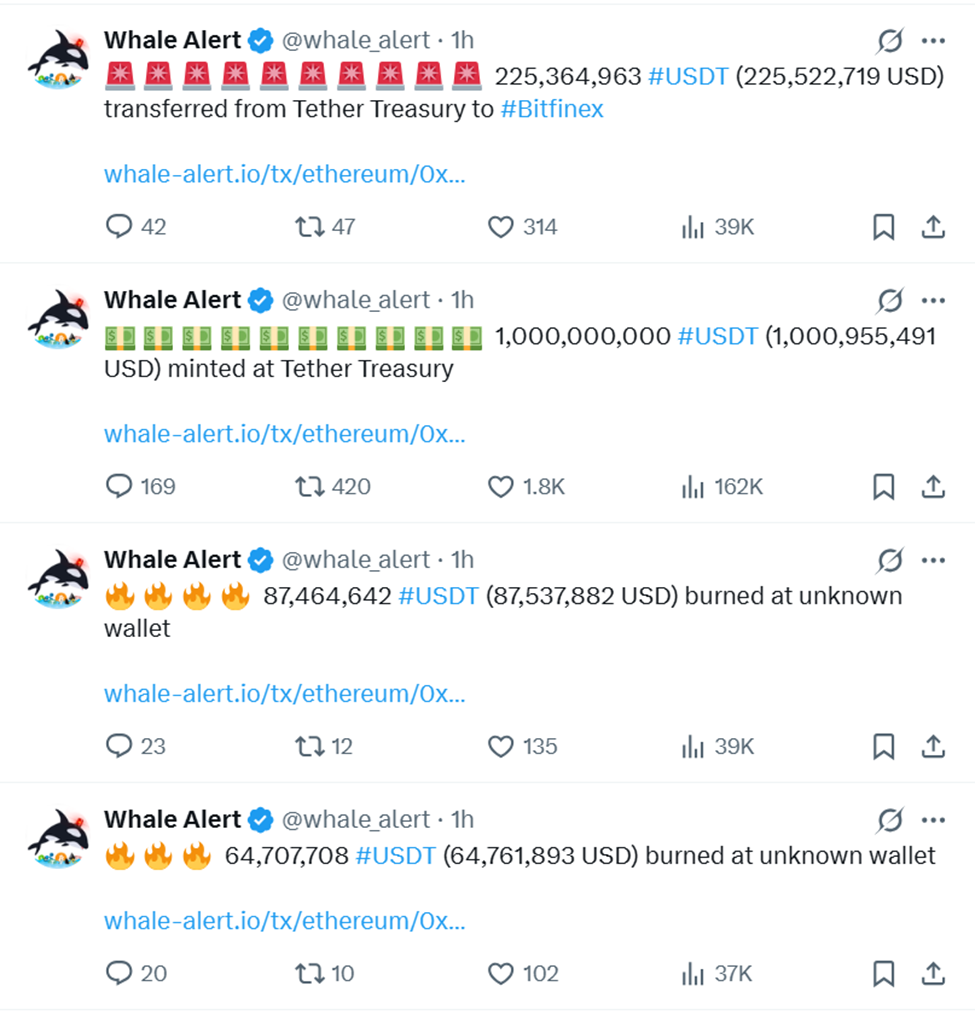 Whale Alert huomautti Tetherin siirtävän lyötyä USDT:tä eri osoitteisiin, mukaan lukien Bitfinex-pörssi. Whale Alert on suosittu tili, joka raportoi suurista ja mielenkiintoisista lohkoketjutapahtumista niiden tapahtuessa.