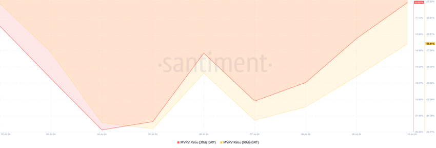 Tokenin MVRV-suhde näyttää negatiivisia arvoja, kun sitä arvioidaan eri liukuvien keskiarvojen perusteella. Erityisesti GRT: n MVRV-suhteet 30 päivän ja 90 päivän liukuville keskiarvoille olivat kirjoitushetkellä -9.45% ja -26.61%.