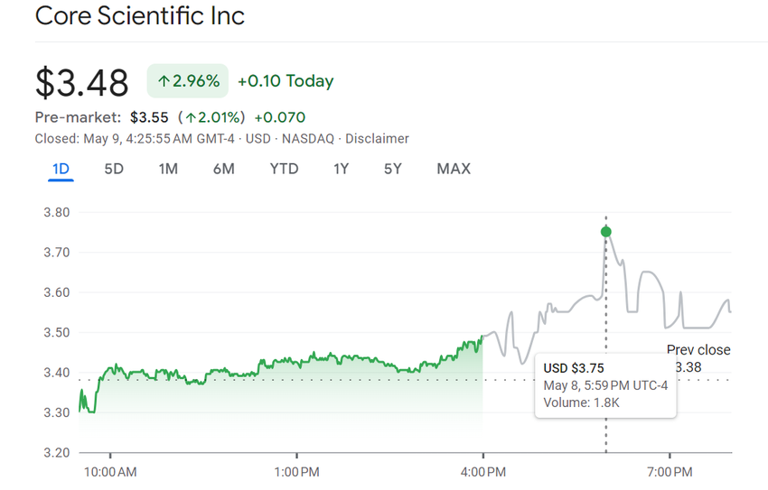 Raportin jälkeen Core Scientificin (CORZ) osake nousi tunnin jälkeisen kaupankäynnin aikana. Se nousi 3,42 dollarista klo 16,38 ET 3,75 dollariin klo 17,59 ET.
