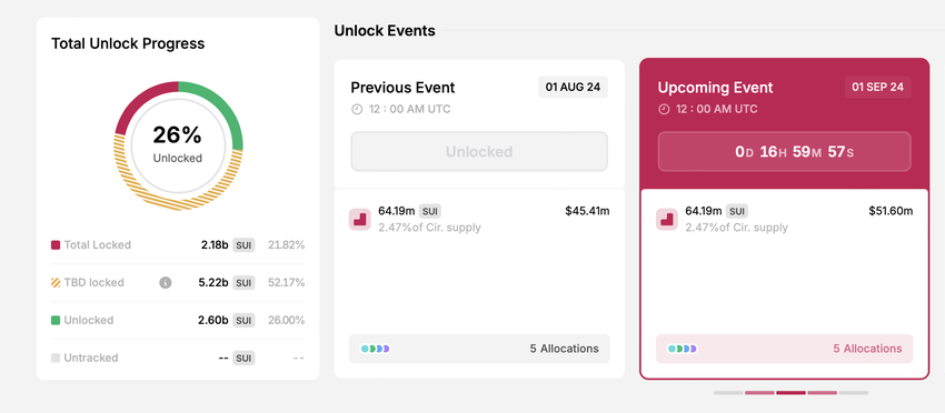 1. syyskuuta Sui vapauttaa 64,19 miljoonaa tokenia. Nämä tokenit, joiden arvo on noin 51,6 miljoonaa dollaria, muodostavat 2,47 % sen kierrossa olevasta tarjonnasta. Näiden tokenien jakautuminen on seuraava: