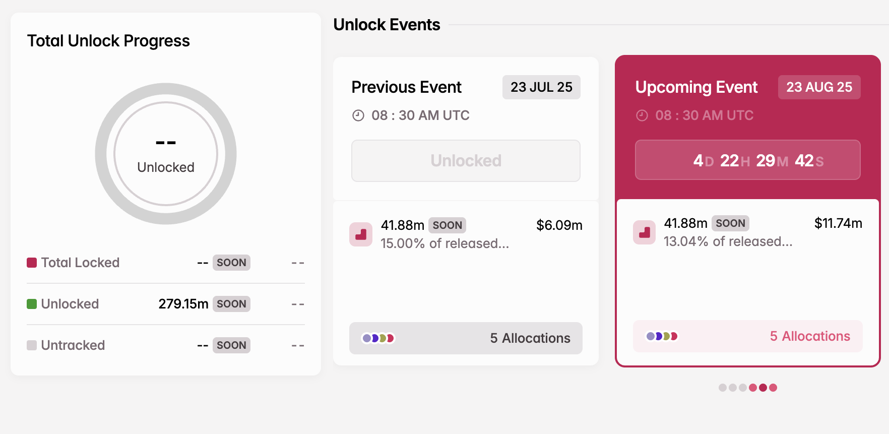 - Avattavien tokenien määrä: 41,88 miljoonaa SOON (4,32 % kokonaismäärästä)