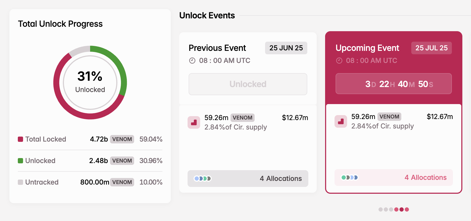 Projekti vapauttaa 59,26 miljoonaa VENOM-tokenia 25. heinäkuuta, noudattaen kuukausittaista cliff-tokenien vapautusmalliaan. Lisäksi tokenien arvo on 12,67 miljoonaa dollaria ja ne edustavat 2,84 % nykyisestä kiertävästä määrästä.