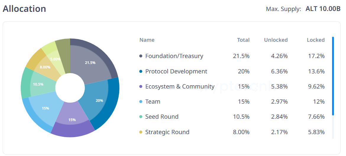 Avattavien tokenien määrä: 240,80 miljoonaa ALT (2,41 % kokonaismäärästä)