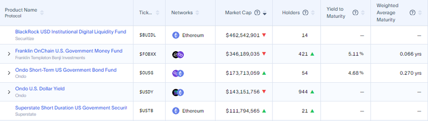 Franklin Templetonin FOBXX seuraa BUIDL: ää 346 miljoonalla dollarilla, kun taas Ondo-protokollan OUSG ja USDY ovat kolmannella ja neljännellä sijalla 173 miljoonalla dollarilla ja 143 miljoonalla dollarilla. Superstate-protokolla sulkee top 5 -listan, jonka markkina-arvo on 111 miljoonaa dollaria.