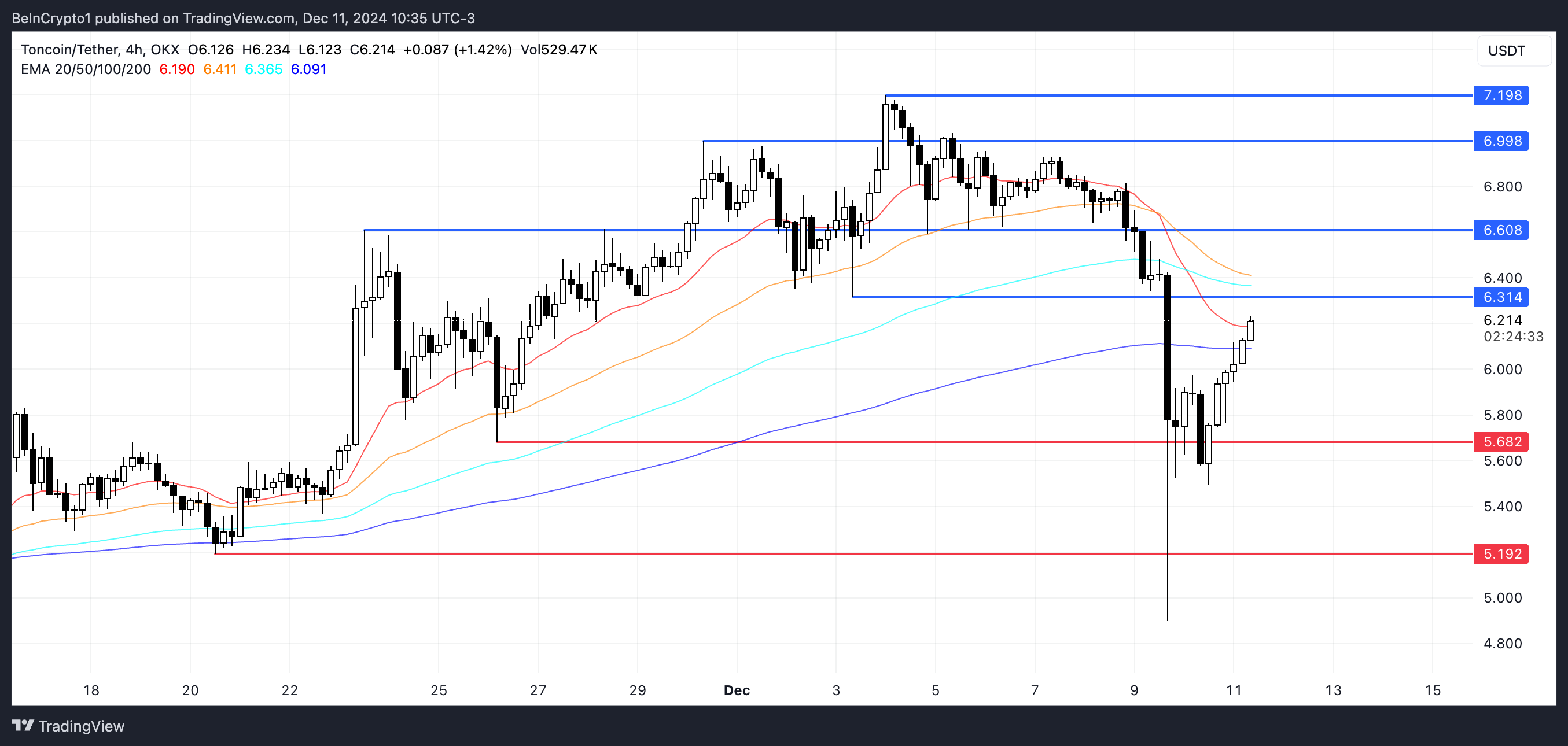 Siitä huolimatta TON:n hinta on sittemmin osoittanut elpymisen merkkejä, kun lyhyen aikavälin EMA:t alkavat kääntyä ylöspäin. Tämä viittaa siihen, että vaikka karhumainen signaali on läsnä, käänteen mahdollisuus on olemassa, jos momentum jatkaa kasvuaan, tehden Toncoinista yhden parhaista altcoineista sijoittaa joulukuussa.
