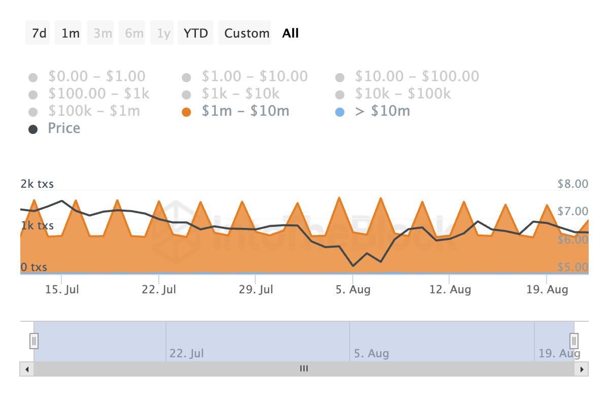 Viime kuukauden aikana ketjuanalyysi on paljastanut suurten TON-siirtojen päivittäisen määrän kasvun. IntoTheBlockin tiedot osoittavat, että TON-siirtojen määrä, joiden arvo on 1 miljoonan ja 10 miljoonan dollarin välillä, on noussut 46% tuona aikana.