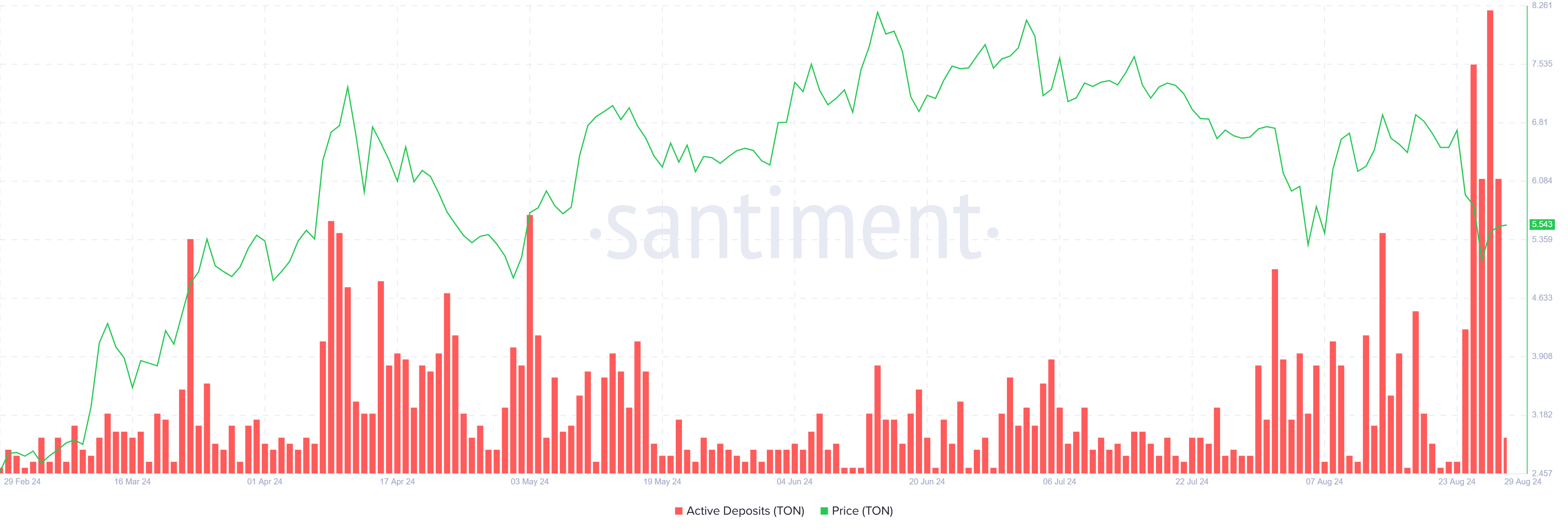 Aktiivisten talletusten tunnuslukujen piikit osoittavat, että TON:n liikkuminen sijoittajien lompakoista pörsseihin lisääntyi. Tämä on merkki skeptisyydestä ja karhumaisuudesta sijoittajien keskuudessa, mikä saattoi johtaa myyntiin, ja niin tapahtuikin.