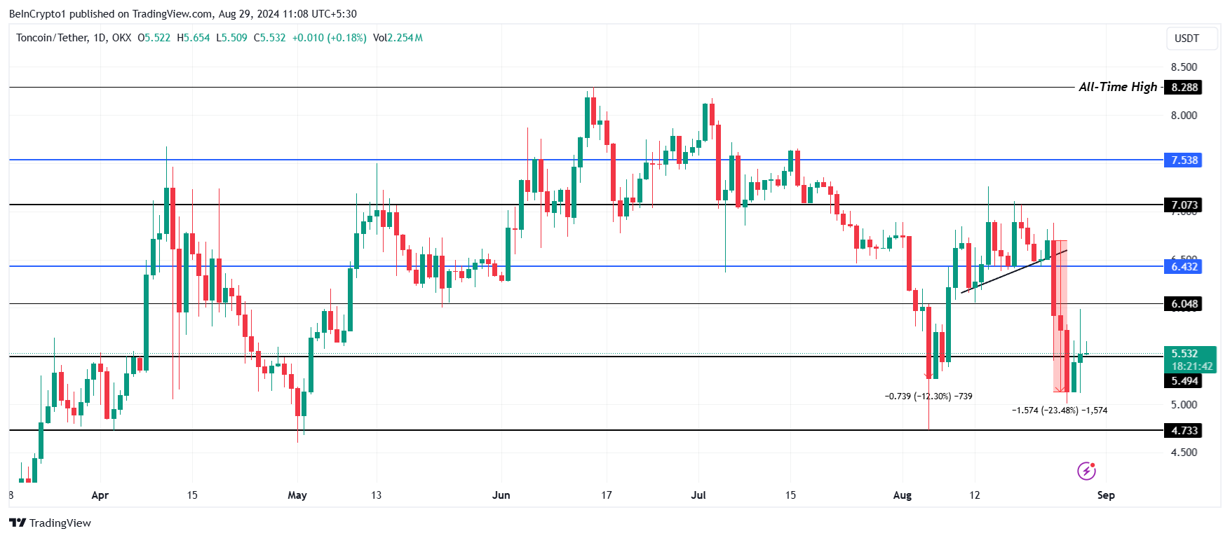 Toncoinin hinta nousi hieman yli 8% viimeisen 48 tunnin aikana, ja eilen havaittiin suuri heilahtelu. Tällä hetkellä vaihtuu 5,53 dollarin hintaan, altcoin pyrkii vakiinnuttamaan 5,49 dollaria tukitasoksi.