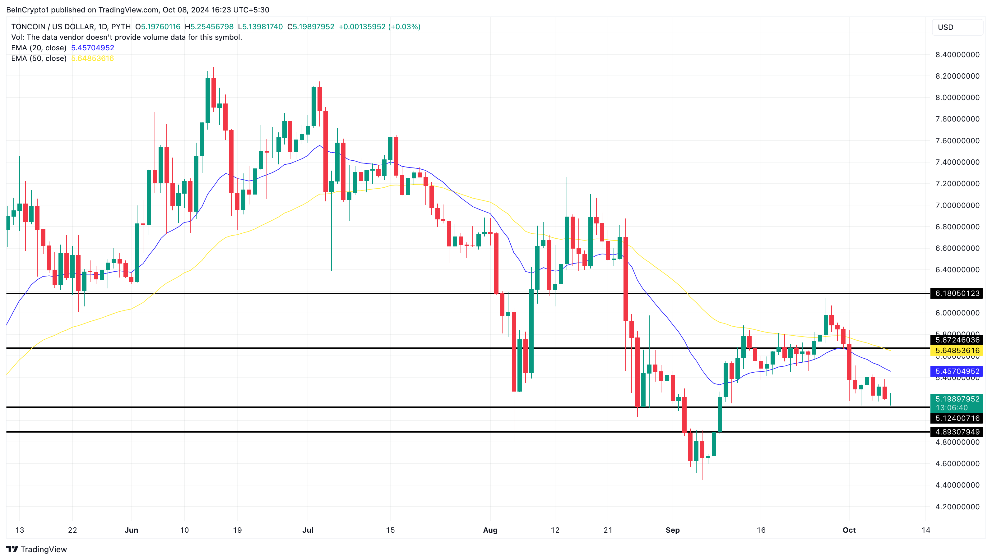 Toisaalta, jos Toncoin nousee EMAn yläpuolelle, karhut eivät ehkä pysty vahvistamaan odotettua laskua. Sen sijaan Toncoinin hinta saattaa ylittää 5,67 dollarin vastuksen ja nousta kohti 6,18 dollaria.