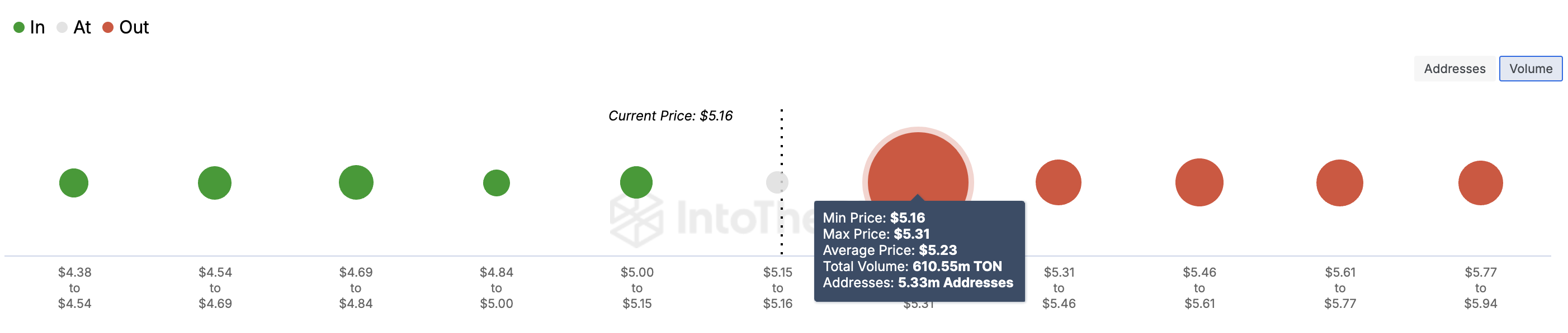 Tämä määrä on suurempi kuin niiden, jotka ostivat sen hintahaarukassa 4,49–5,05 dollaria. Se on myös paljon suurempi kuin määrä, jonka 8,330 osoitetta ostivat tasapainopisteessä. Tässä tilanteessa TON:n on epätodennäköistä saada tukea näiltä osoitteilta.