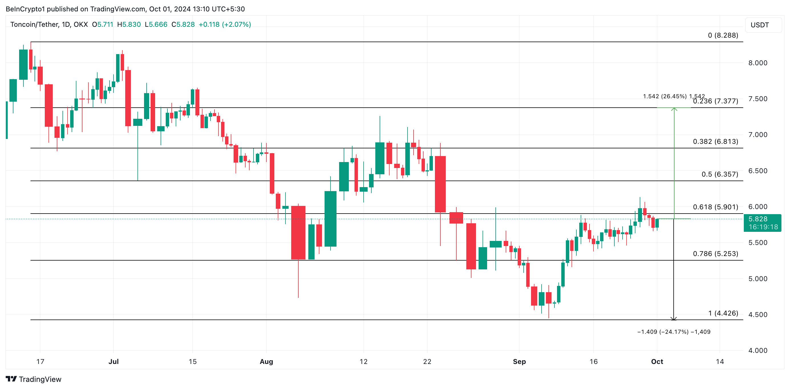 Huolimatta TON:n kysynnän noususta viime päivinä, kauppiaat eivät jaa samaa mielipidettä sen alkuperäisestä kolikosta. Altcoin käy tällä hetkellä kauppaa 5,82 dollarin hintaan, mikä on 4% lasku viimeisen kolmen päivän aikana.