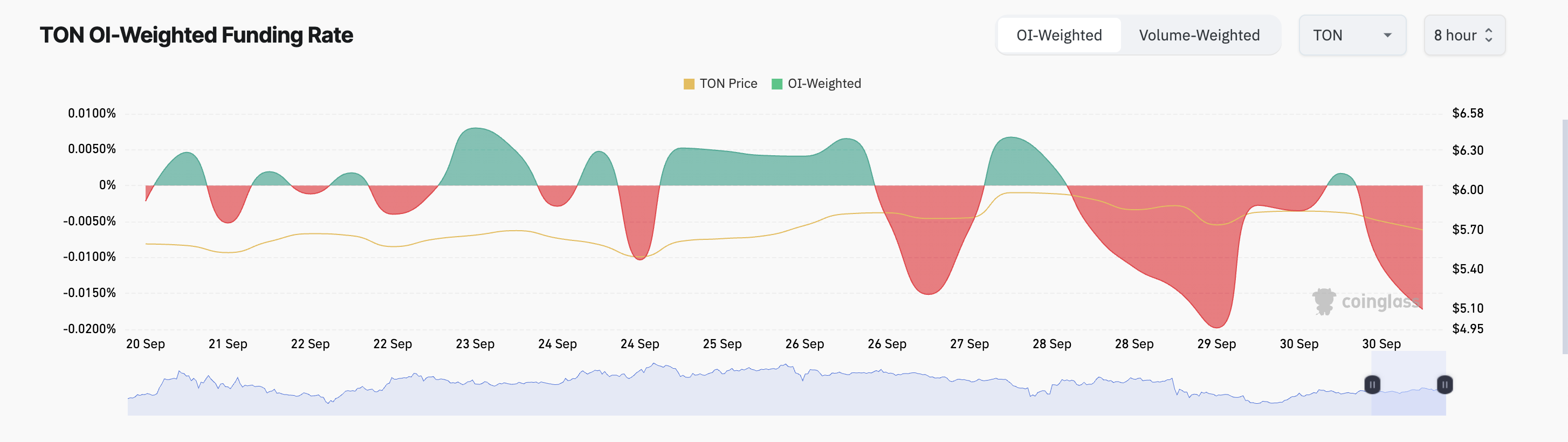 TON:iin kohdistuva karhumainen asenne heijastuu myös sen negatiivisissa rahoitusasteissa viime päivinä. Kun omaisuusvaran rahoitusaste on negatiivinen, lyhyiden positioiden myyntiä suositaan enemmän kuin pitkiä positioita. Useammat kauppiaat ennakoivat omaisuusvaran hinnan laskua, mikä johtaa lisääntyneeseen lyhyiden myyntiin, joka yleensä heijastaa karhumaista tunnelmaa markkinoilla.