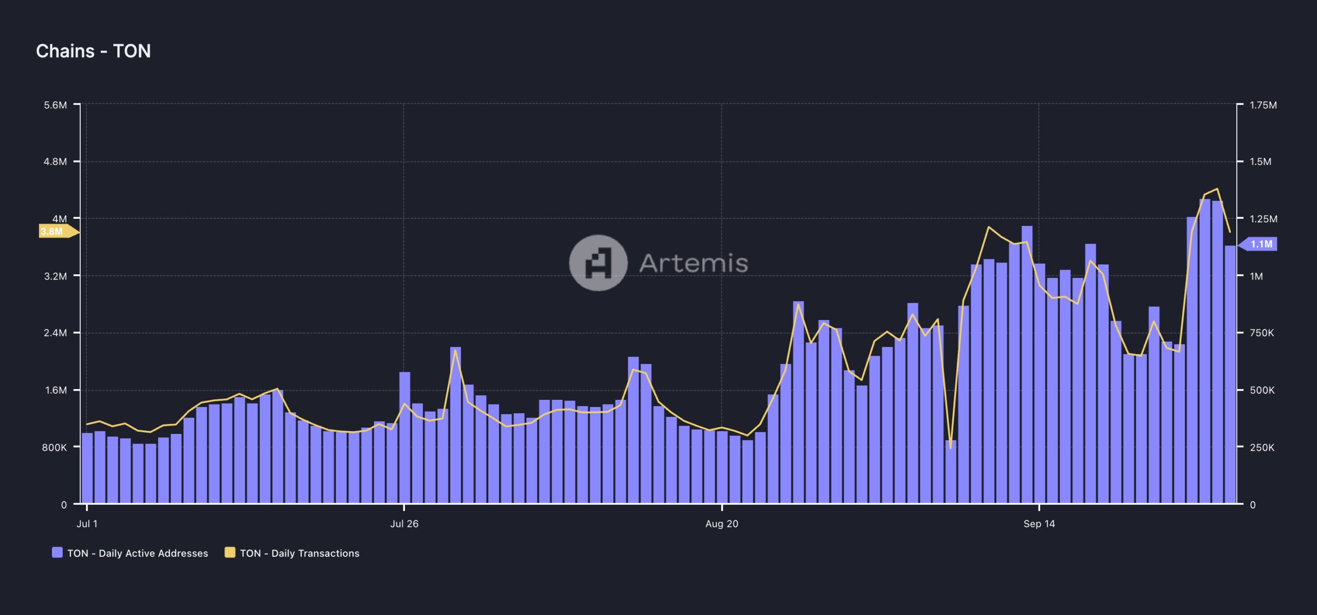 TON on kokenut verkon kysynnän nousun viime kuukauden aikana, ja Artemiksen tiedot paljastavat 74% kasvun ainutlaatuisissa aktiivisissa osoitteissa, jotka ovat suorittaneet vähintään yhden siirron viimeisen 30 päivän aikana. Samana aikana suoritettiin 4 miljoonaa siirtoa, mikä heijastaa 67% kasvua päivittäisessä siirtomäärässä verkossa.