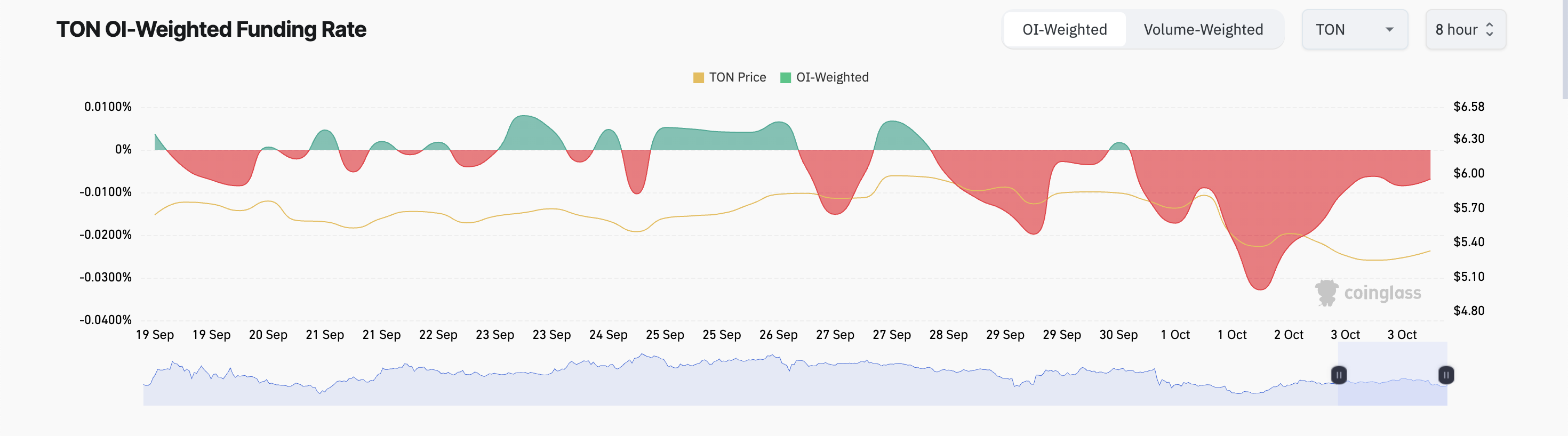 Toncoinin rahoitusaste on pysynyt pääosin negatiivisena viime aikoina, mikä osoittaa kauppiaiden puutteen luottamuksesta lyhyen aikavälin hinnan palautumiseen. Tätä kirjoitettaessa tämä on -0,0068%.