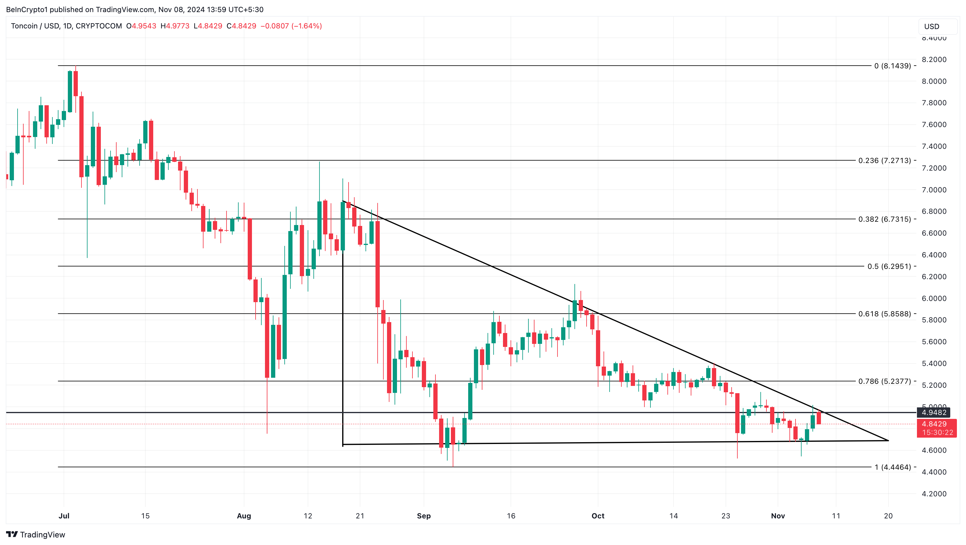 Päivittäisessä kaaviossa TON:n hinta jatkaa kaupankäyntiä laskevassa kolmiossa, mikä eroaa monien muiden altcoinien äskettäisestä läpimurrosta.