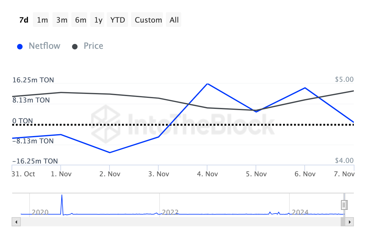 Yksi merkittävimmistä Toncoinin tunnusluvuista, joka ajaa TON:n hinnan alle 5 dollaria, on suurten omistajien nettovirta. Suurten omistajien nettovirta mittaa osoitteiden toimintaa, jotka pitävät hallussaan 0,1%:sta 1%:iin kokonaiskiertomäärästä.