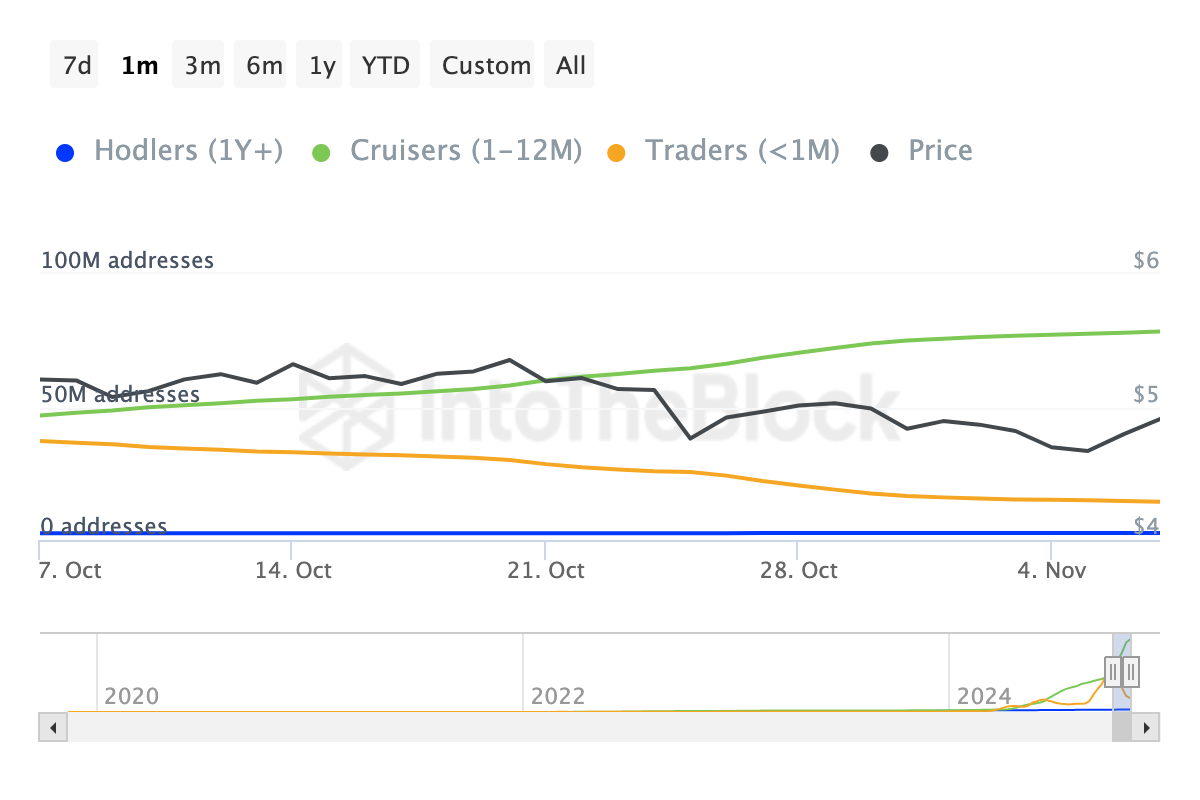 Esimerkiksi “Osoitteet ajan mukaan” -data osoittaa, että monet sijoittajat, jotka hankkivat TON:ia viimeisen 30 päivän aikana, ovat päättäneet myydä eivätkä pitää. Lisäksi tällainen myyntikäyttäytyminen usein asettaa painetta tokenin arvon laskulle.