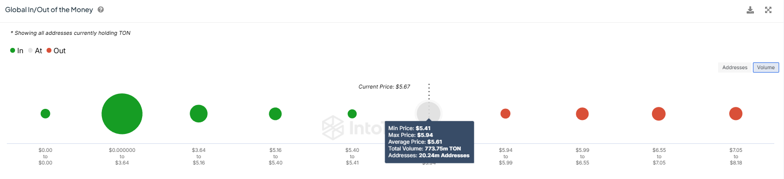 Toncoin on lähellä merkittävää voittoläpimurtoa, joka voisi tuoda miljardeja dollareita markkinoille. Global In/Out of the Money (GIOM) -indikaattorin tiedot paljastavat, että noin 773 miljoonaa TON-kolikkoa, arvoltaan noin 4,2 miljardia dollaria, on ostettu hintatasojen 5,41 ja 5,94 dollarin välillä. Jos TON onnistuu rikkomaan 5,96 dollarin rajan, koko tässä hintahaarukassa ostettu tarjonta muuttuisi voitolliseksi.