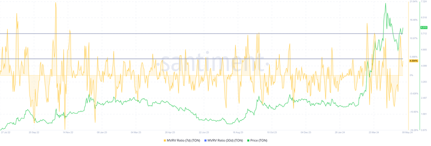 Lisäksi omaisuuserä on tällä hetkellä yliarvostettu lyhyen aikavälin markkina-arvon ja toteutuneen arvon (MVRV) suhteen mukaan. MVRV-suhde arvioi sijoittajan voittoa tai tappiota. Toncoinin 7 päivän MVRV on 5,2 %, mikä merkitsee voittoa, mikä saattaa johtaa myyntiin. Historiallisesti TON-korjaukset tapahtuvat 4–12%: n MVRV-alueella, mikä merkitsee sen vaaravyöhykkeeksi.