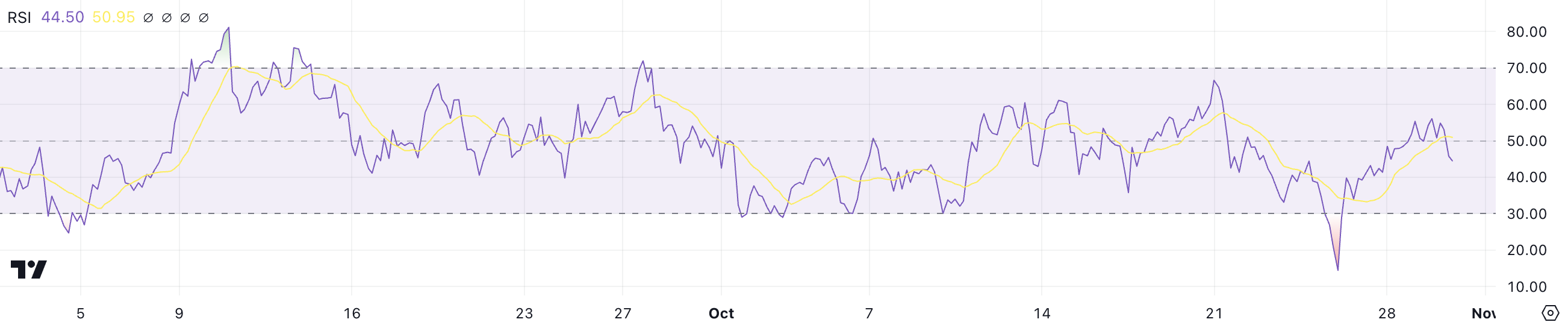 TON:n suhteellinen vahvuusindeksi (RSI) on äskettäin laskenut 44,50:een, alentuen 54:stä vain päivä sitten. Tämä lasku osoittaa, että TON:n ostovoima on heikentynyt, mikä viittaa nousumomentin heikkenemiseen.