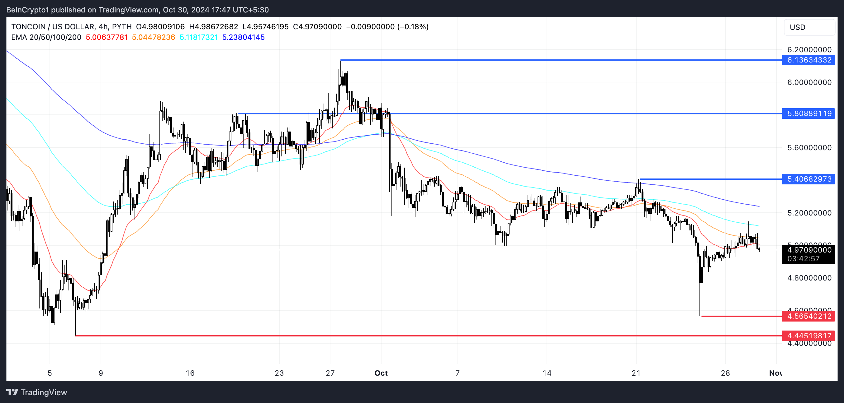 Jos nykyinen laskutrendi jatkuu, TONin hinta kohtaa välittömän tuen 4,56 dollarissa. Jos tämä taso pettää, hinta voi laskea jopa 4,44 dollariin, mikä johtaisi mahdolliseen 10,6% korjaukseen. Päinvastaisessa tapauksessa, jos markkinat kääntyvät, TON voi haastaa vastustason 5,40 dollarissa ja jopa 5,80 dollarissa. Tämä voi olla ajettu uusien käyttäjien liittymisellä TON-lohkoketjuun.