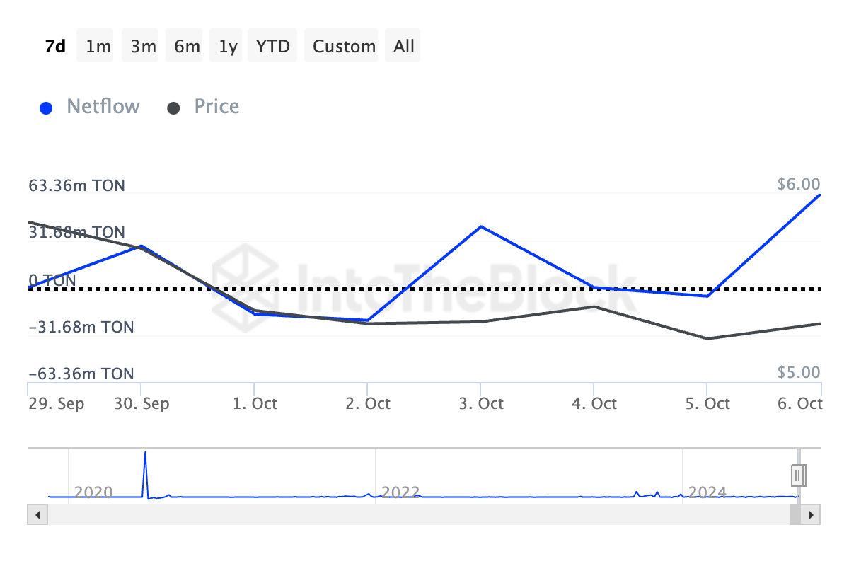 Viime viikolla TON:n suuret omistajat eli valaat ovat lisänneet kertymistään, kuten IntoTheBlockin tiedot ovat paljastaneet 124 %:n kasvun viimeisen seitsemän päivän aikana.