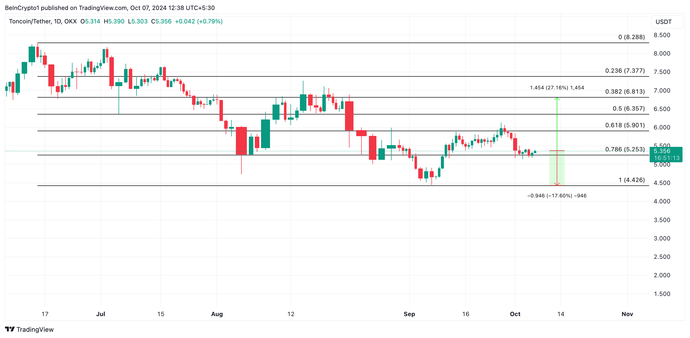 Kuitenkin, jos voiton tavoittelu laukaisee enemmän myyntiä, Toncoinin hinta saattaa laskea 18 %, mahdollisesti pudoten 4,42 dollariin.