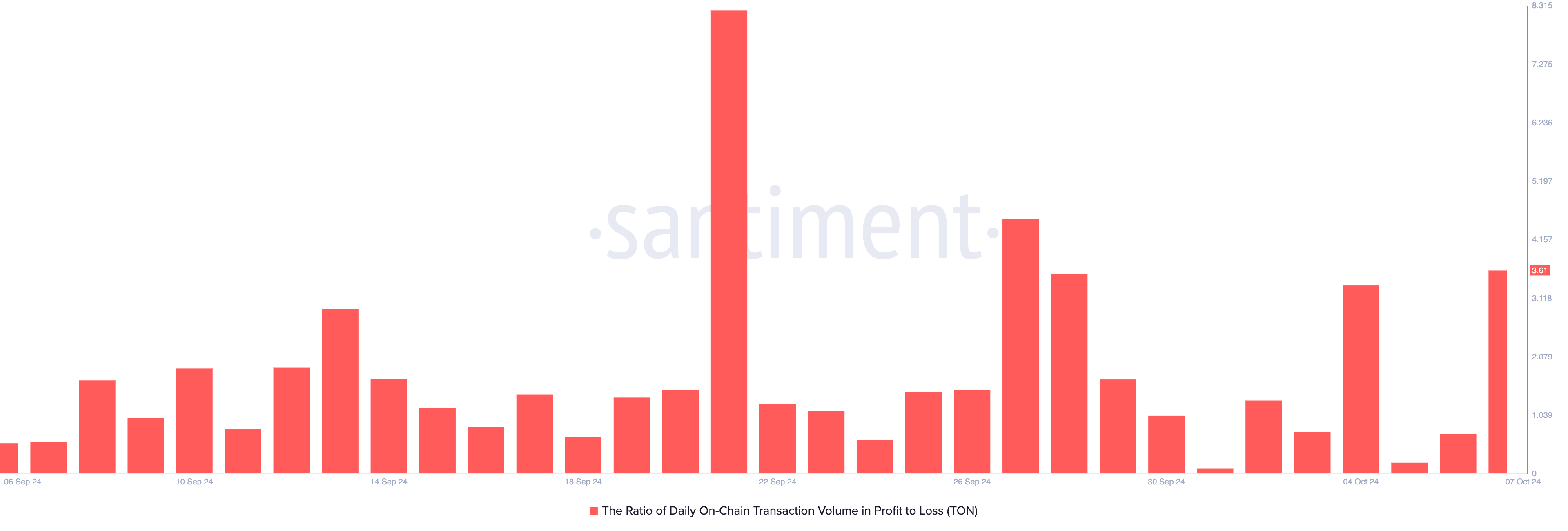 Lisäksi valaiden toiminnan kasvu on laukaissut Toncoinin hinnan nousun viime viikonlopusta lähtien, ja monet kaupat tuottavat nyt voittoa. Maanantaisin TON:n päivittäisen kaupankäyntivolyymivoiton ja -tappion suhde on 3,61, mikä on korkein kymmeneen päivään. Tämä osoittaa, että jokaista tappiollista kauppaa kohden on 3,61 voitollista kauppaa.