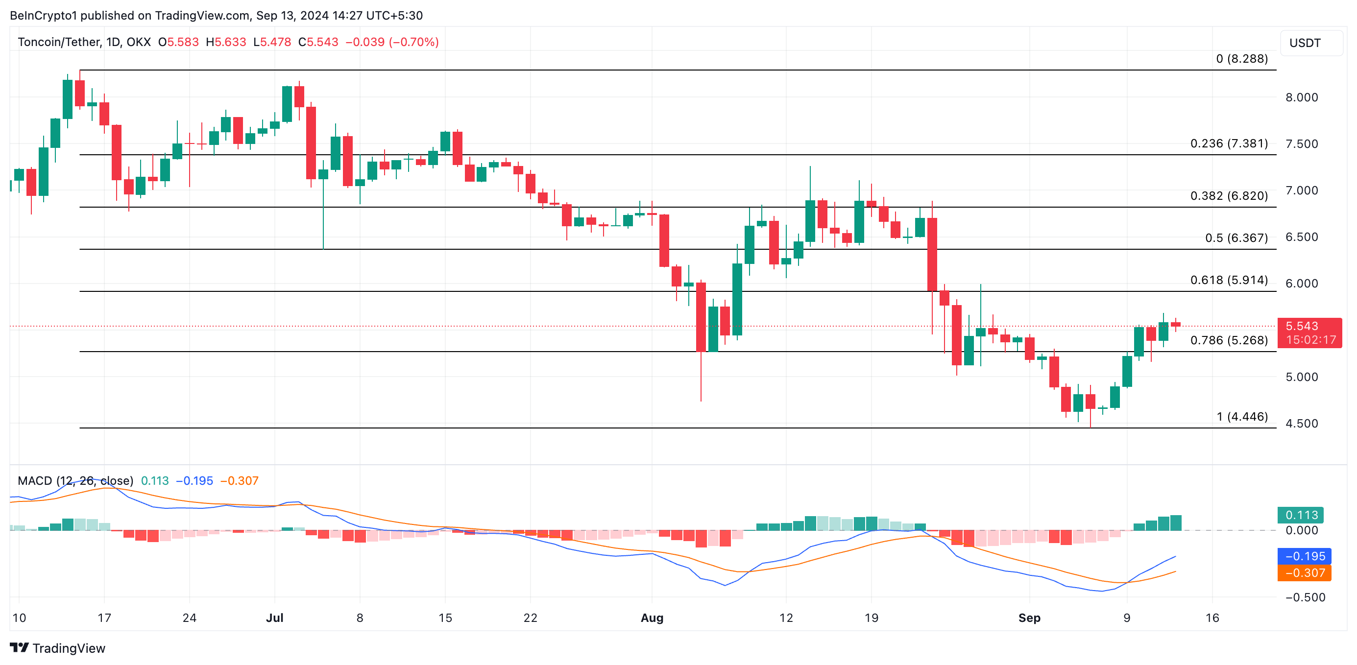 TONin tekninen asetelma vahvistaa, että altcoin on valmis laajentamaan voittojaan. Esimerkiksi Liukuvien Keskiarvojen Konvergenssi/Divergenssi (MACD) -indikaattori — joka seuraa suuntauksen suuntaa, muutoksia ja mahdollisia hintakäännepisteitä — vahvistaa kasvavan kysynnän altcoinille. Kirjoitushetkellä TONin MACD-viiva (sininen) lepää signaaliviivan (oranssi) yläpuolella ja on matkalla kohti nollaviivaa.
