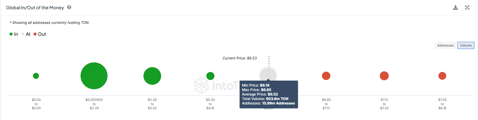 Global In/Out of the Money (GIOM) -indikaattorin mukaan sijoittajat ostivat 803 miljoonaa TONia hintojen ollessa 6,16 ja 6,85 dollaria välillä. Tällä hetkellä altcoin vaihtaa omistajaa 6,52 dollarin hintaan, ollen lähellä ylärajan rikkomista.