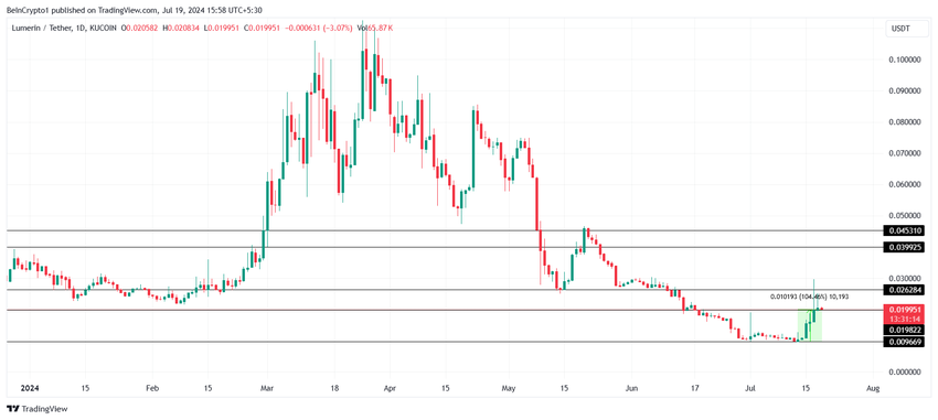 Toinen suuri laukaus viikon aikana oli Lumerin, joka ongelmista huolimatta onnistui rekisteröimään 104%: n nousun. Vaikka tekoälytoken on noussut huomattavasti, altcoin on lähes saavuttanut 0,030 dollaria.