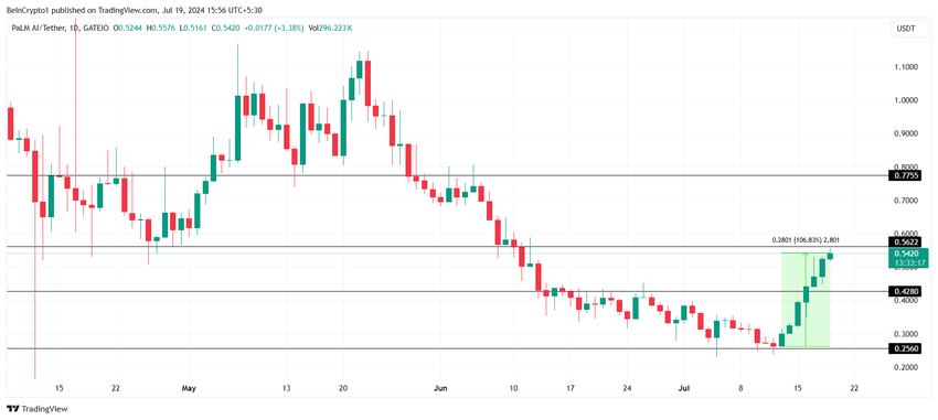 Palm AI on yksi harvoista altcoineista, joka on huomannut tasaisen kasvun, ja koko viikko rekisteröi vain vihreitä kynttilänjalkoja. Tämä nosti tekoälytokenin 106 %, jolloin altcoinin arvo oli 0,54 dollaria.