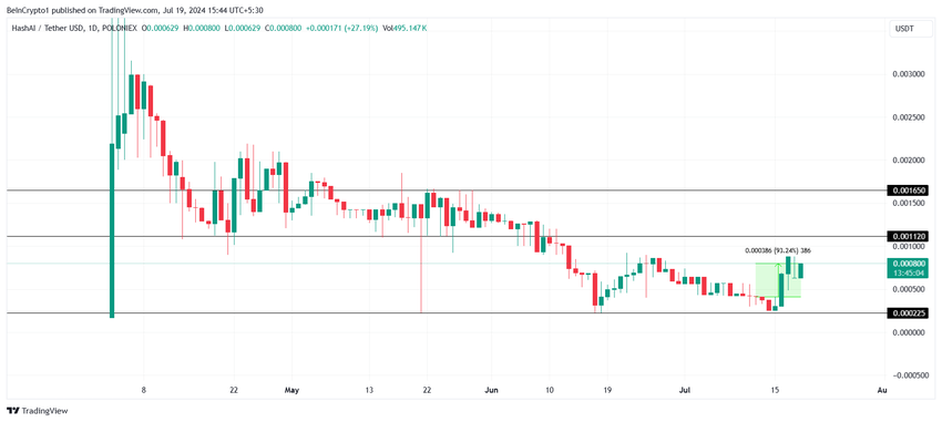 Edellä mainittujen tekoälytokenien johdolla oli Hash AI. Kryptovarat nousivat viikon aikana 93 % ja nousivat kirjoitushetkellä 0,000240 dollarista 0,000800 dollariin. Jos nousu jatkuisi, HASHAI olisi varmasti voinut rikkoa 0,001000 dollaria.
