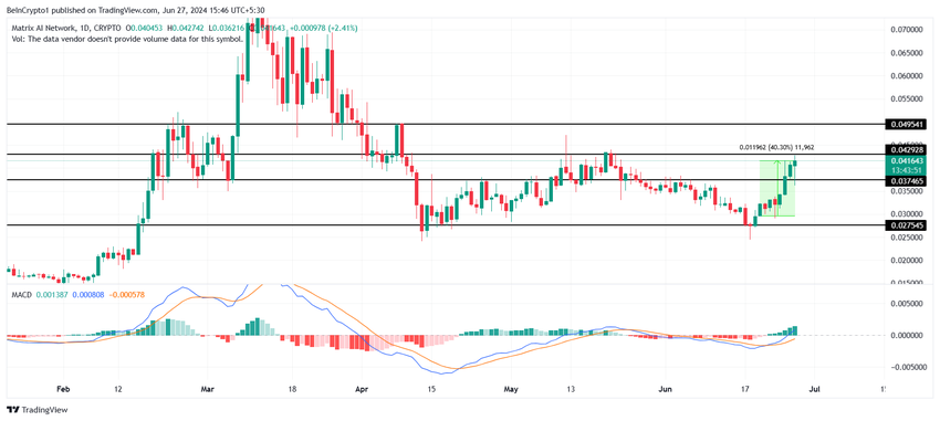 Matrix AI Networkin (MAN) hinta oli melko hyvä viime viikolla, ja se nousi yli 40 % viikon aikana. Tekoälytoken pomppasi takaisin kriittisestä tuesta 0,027 dollarissa vaihtaakseen omistajaa 0,041 dollarissa kirjoitushetkellä.