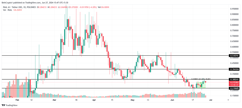 PAAL AI (PAAL) nousi 22 % viimeisen viikon aikana, kun altcoin tuumasi lähellä estettä 0,30 dollarissa. 0,27 dollarilla kauppaa käyvä PAAL voisi ottaa mahdollisuuden saada takaisin toukokuun puolivälistä viime viikkoon todetut tappiot.