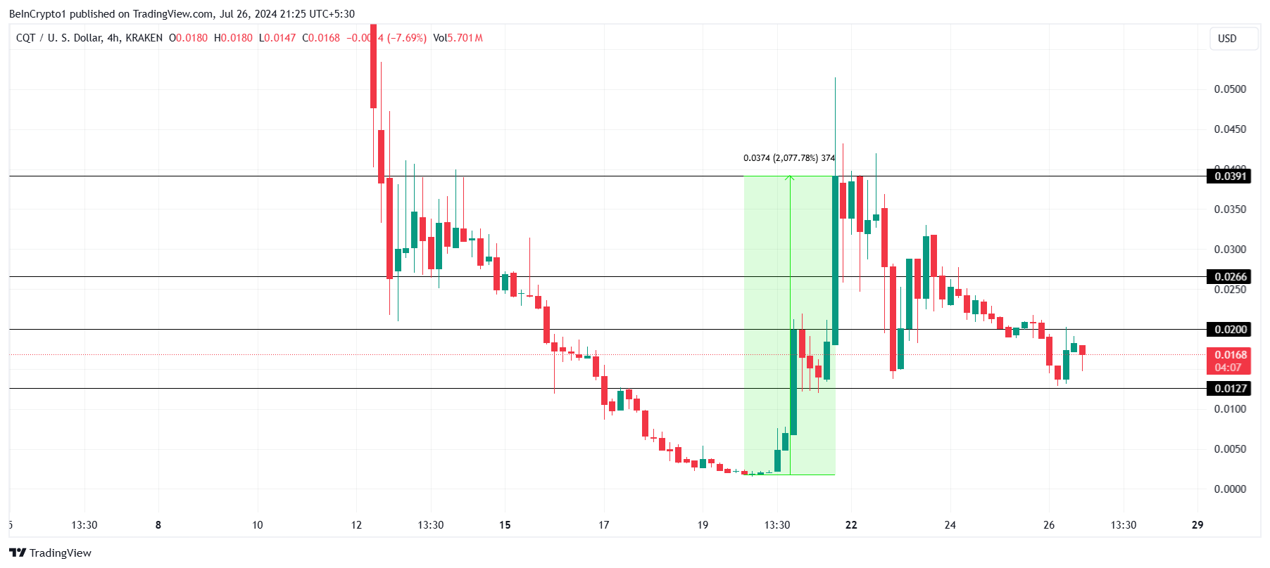 Lasku johtui laajemman markkinan karhumaisista signaaleista ja laski CQT:n 0,016 dollariin. Tämä vähensi kokonaisnousun 337 %:iin, tehden palautumisesta seuraavan mahdollisen siirron AI-kolikolle.