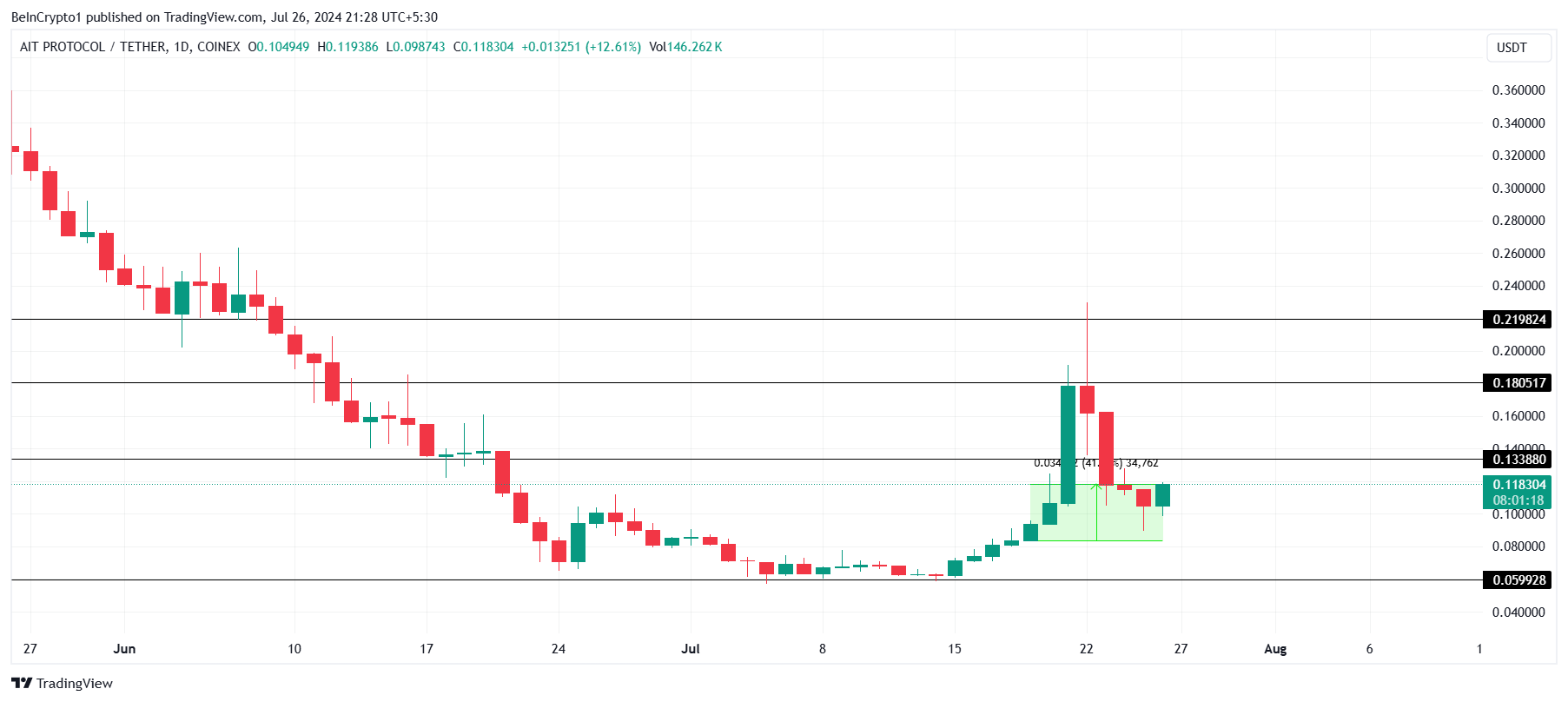 AIT Protocol on noussut viimeisen seitsemän päivän aikana 41 %, käyden kauppaa 0,118 dollarissa sen jälkeen, kun se ei onnistunut rikkomaan 0,180 dollarin vastusta. Tämä alamäki vaikutti hieman AIT:n omistajien lyhyen aikavälin voittoihin.