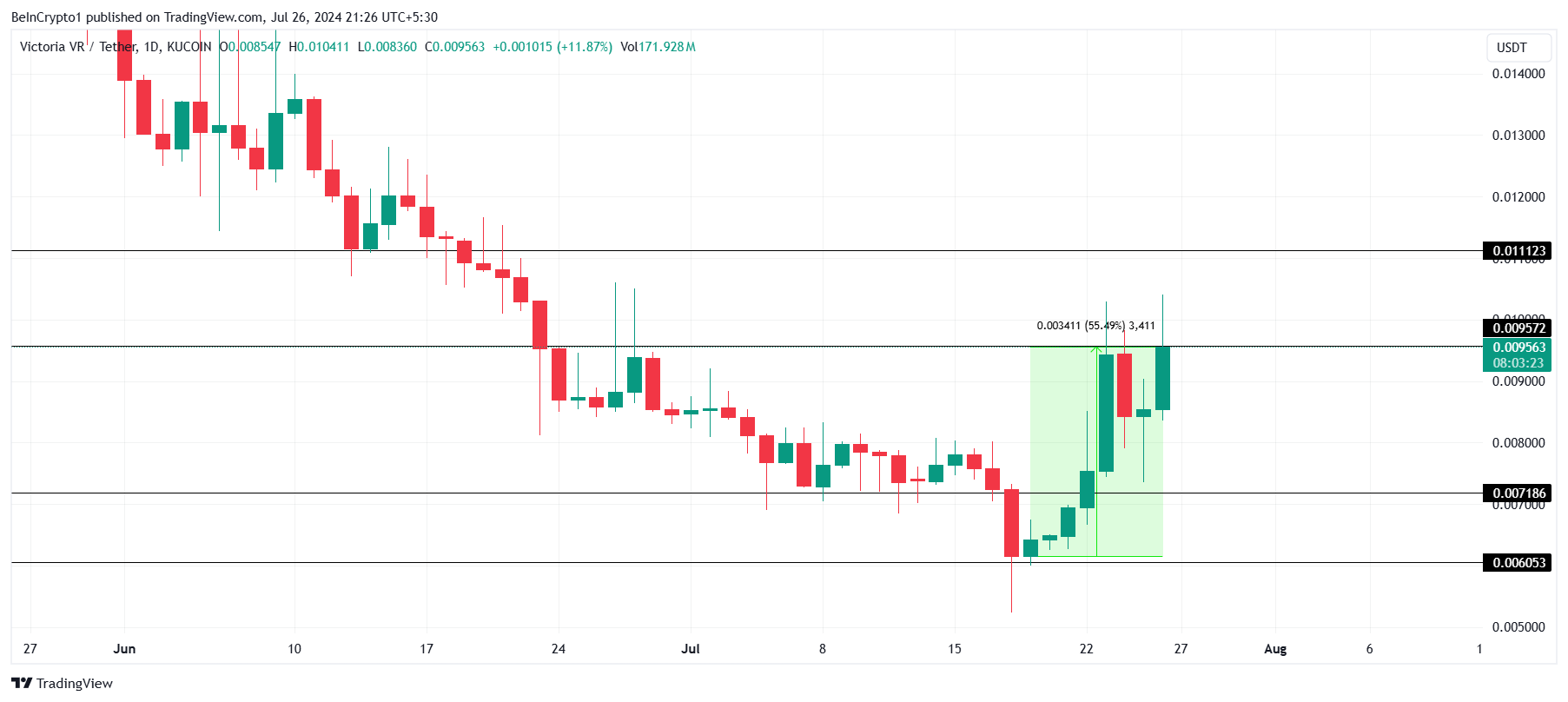 Seuraavana listalla on Victoria VR, joka koki melko vakaan rallin, nousten 55 % 0,00605 dollarista 0,00956 dollariin. Tämä sysäys vei altcoinin kuukauden korkeimpaan, lähelle 0,00957 dollarin rikkomista.