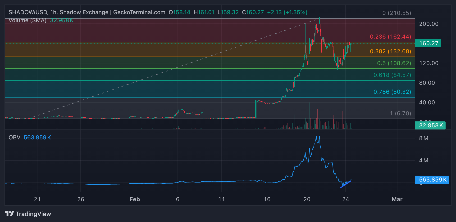 Kun se nousee, se osoittaa vahvaa ostokiinnostusta. Tämä viittaa siihen, että SHADOW:n hinta saattaa jatkaa nousuaan kysynnän kasvaessa. Jos näin tapahtuu, se voisi murtautua vastuksen yläpuolelle 162,44 dollariin ja saavuttaa 210,55 dollaria.