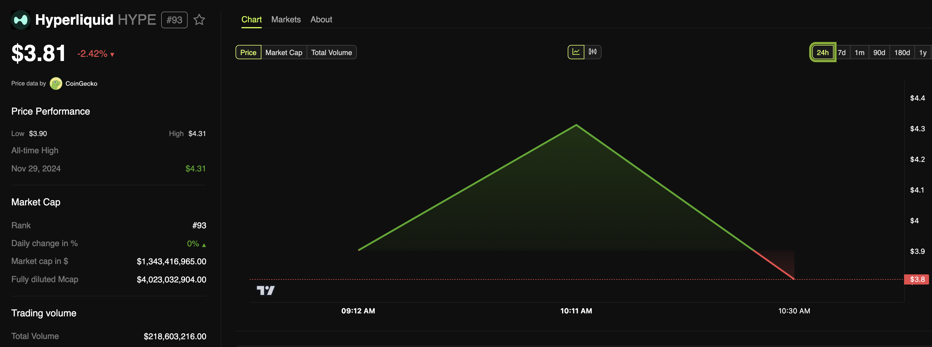 Projektin mukaan jaetut tokenit edustavat 31 % sen kokonaismäärästä, mikä vastaa 310 miljoonaa tokenia. Kirjoitushetkellä HYPE:n hinta on noin 3,81 dollaria eikä sitä ole vielä listattu mihinkään keskitettyyn pörssiin.