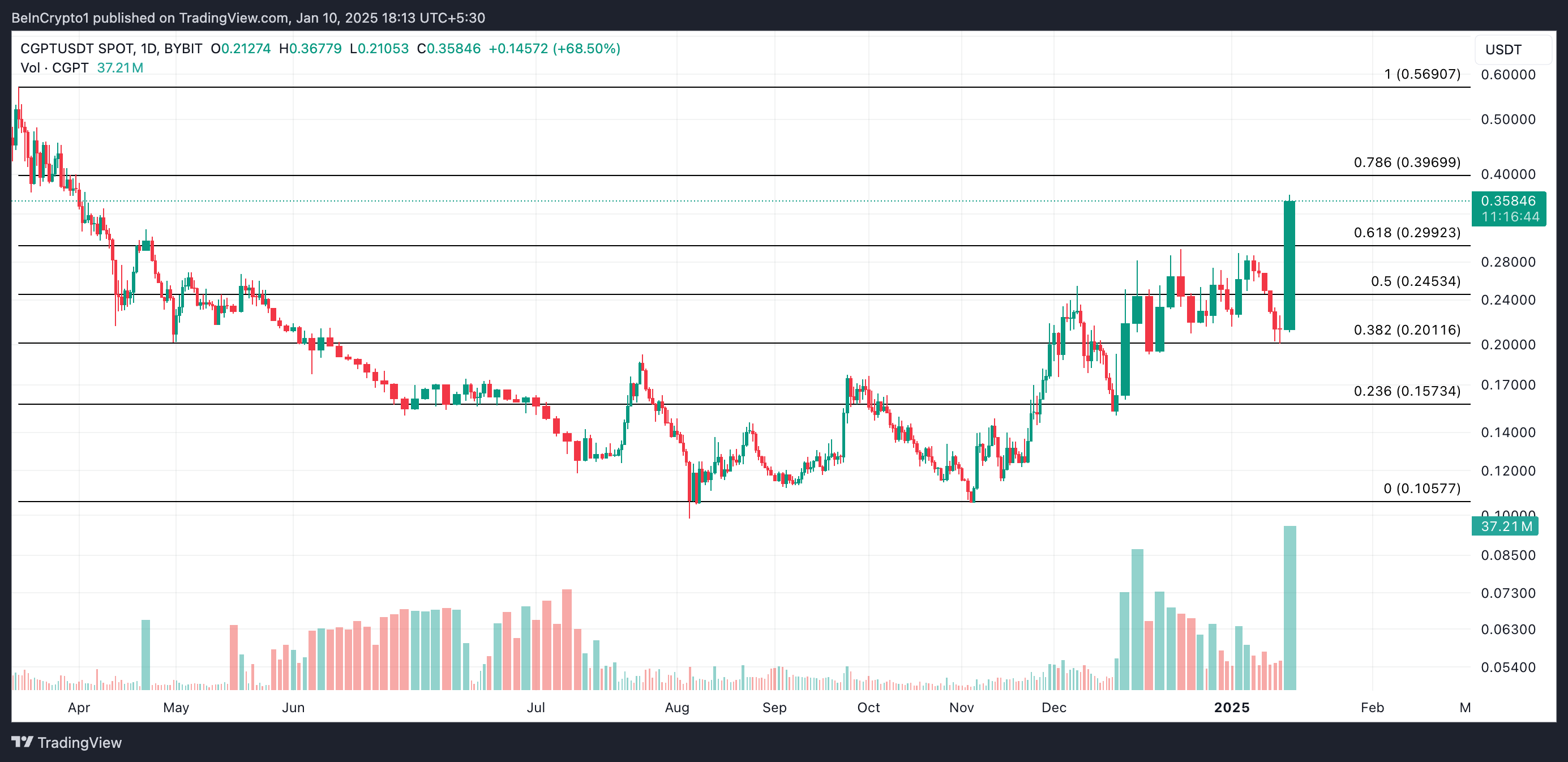 Kaupankäyntivolyymin kasvaessa altcoin on valmis jatkamaan nousuaan. Noususkenaariossa CGPT voi yrittää hintarallia kohti kaikkien aikojen korkeinta arvoaan 0,56 dollaria, joka saavutettiin viimeksi maaliskuussa. Tämän toteutumiseksi sen on kuitenkin murtauduttava yli 0,39 dollarin vastustason.