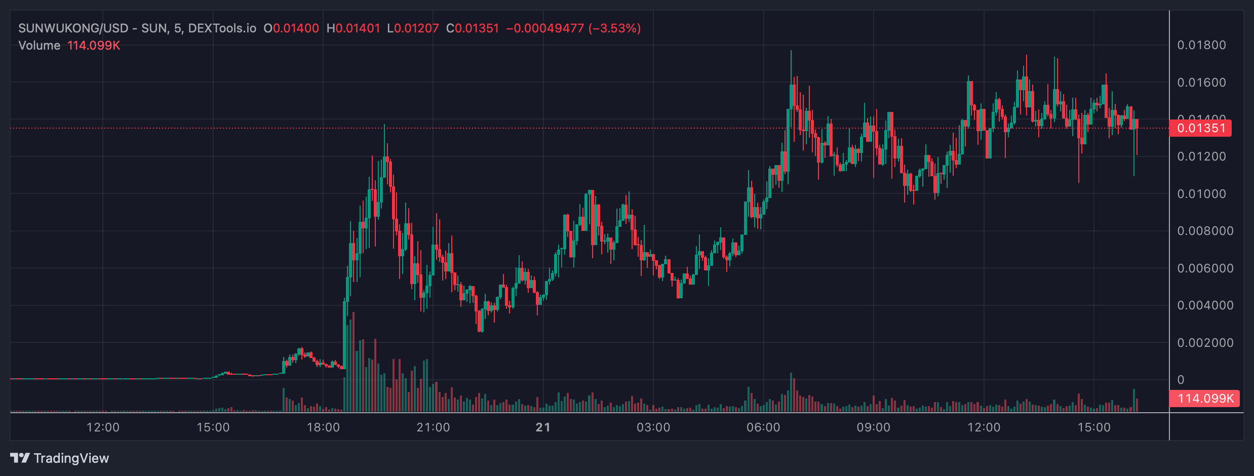 WUKONG nousi lähes 1 300 % viimeisen 24 tunnin aikana, liittyen Tronin meemikolikoiden joukkoon, jotka ovat nousseet jyrkästi Sundogin nousun myötä. Toisin kuin muut Justin Sunin villityksen ajamat meemikolikot, WUKONG sai vauhtia Black Myth: Wukong -pelistä. Peliä mainostetaan Kiinan kunnianhimoisimpana yrityksenä luoda jymymenestys videopeli. Se houkutteli yli miljoona pelaajaa tunneissa julkaisunsa jälkeen.