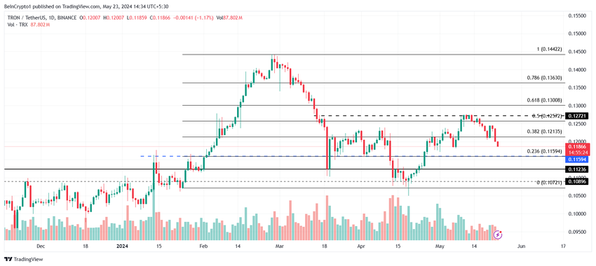 Tronin hinta käy kauppaa 0,118 dollarissa, mikä on lähempänä ratkaisevaa 0,115 dollarin tukea. Tämä taso on kriittinen, koska se on sama kuin 23,6% Fibonacci-retracement. Tämä Fib-taso, joka tunnetaan karhumarkkinoiden tukilattiana, ehdottaa massiivisia korjauksia, jos hinta laskee sen alapuolelle.