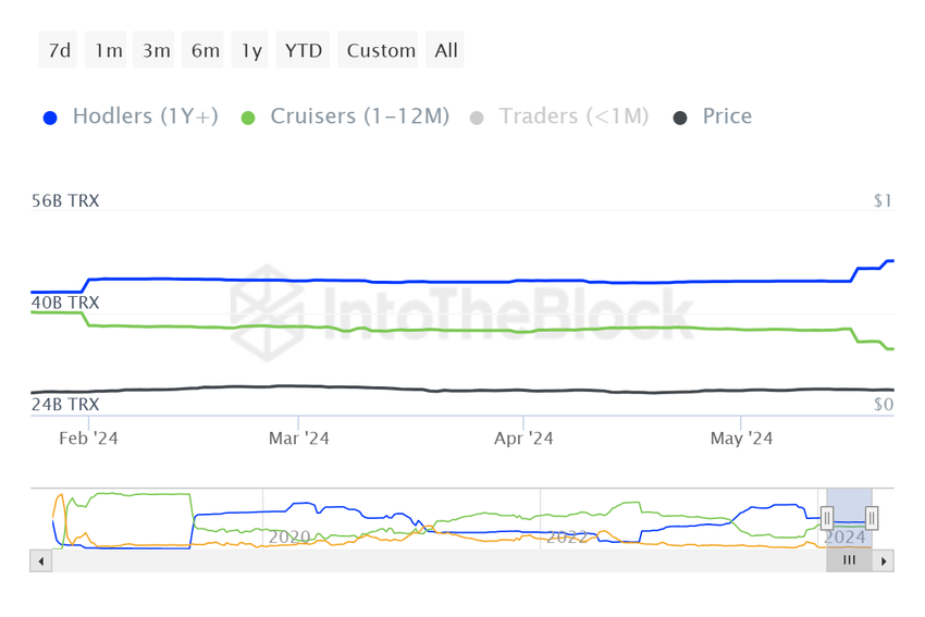 Tronin hinta voitaisiin pelastaa laskevilta näkymiltä sijoittajien avulla. TRX:n haltijat osoittavat edelleen uskoa omaisuuserään, koska he pidättäytyvät myymästä mitään omistuksiaan. Tämä on johtanut siihen, että noin 4% kiertävästä tarjonnasta, joka edustaa lähes 3,1 miljardia TRX: ää, siirtyy pitkäaikaisten haltijoiden (LTHS) lompakoihin.