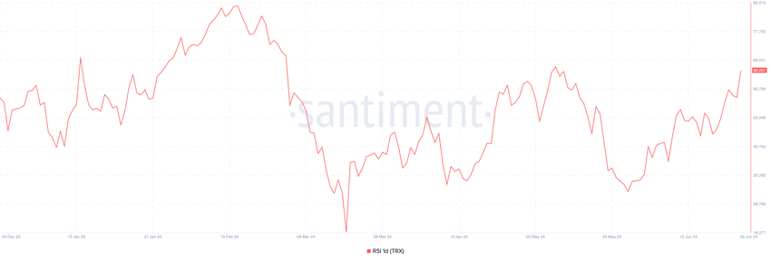 Esimerkiksi sen suhteellinen voimaindeksi (RSI) on 66,25 kirjoitushetkellä ja nousutrendissä. Tämä mittari mittaa TRX:n yliostettuja ja ylimyytyjä markkinaolosuhteita.
