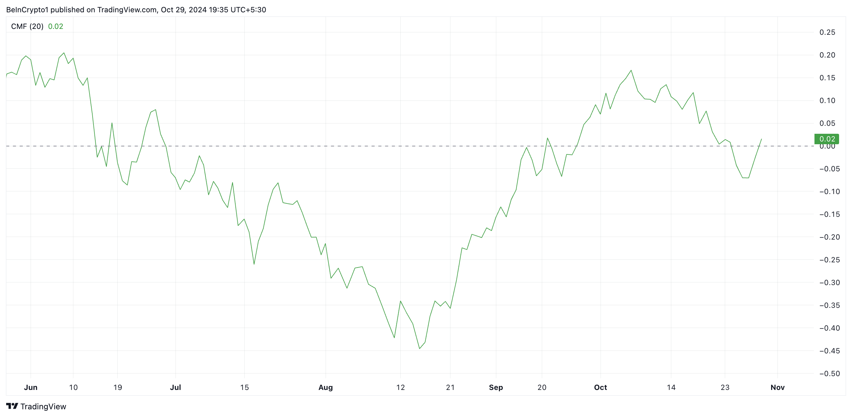 TRUMP:n viimeaikainen hintaralli Chaikin Moving Average (CMF) -indikaattorin noustessa nollaviivan yläpuolelle vahvistaa härkämäisen uudelleenheräämisen meemikolikon markkinoilla. Tämä indikaattori, joka mittaa rahan virtausta markkinoille ja pois markkinoilta, on noususuunnassa arvossa 0,02.