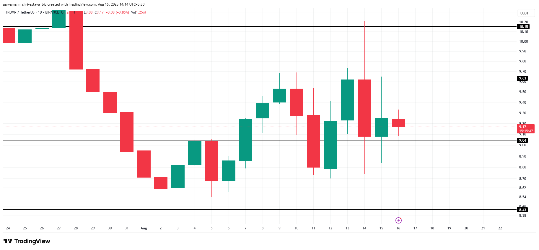 TRUMP käy tällä hetkellä kauppaa 9,17 dollarilla, pysyen 9,04 dollarin tukitason yläpuolella. Tämä vaihteluväli viittaa siihen, että hinta voi jatkaa konsolidoitumista 9,04 dollarin tuen ja 9,63 dollarin vastuksen välillä. Markkinoiden päättämättömyys viittaa matalan volatiliteetin kauteen.