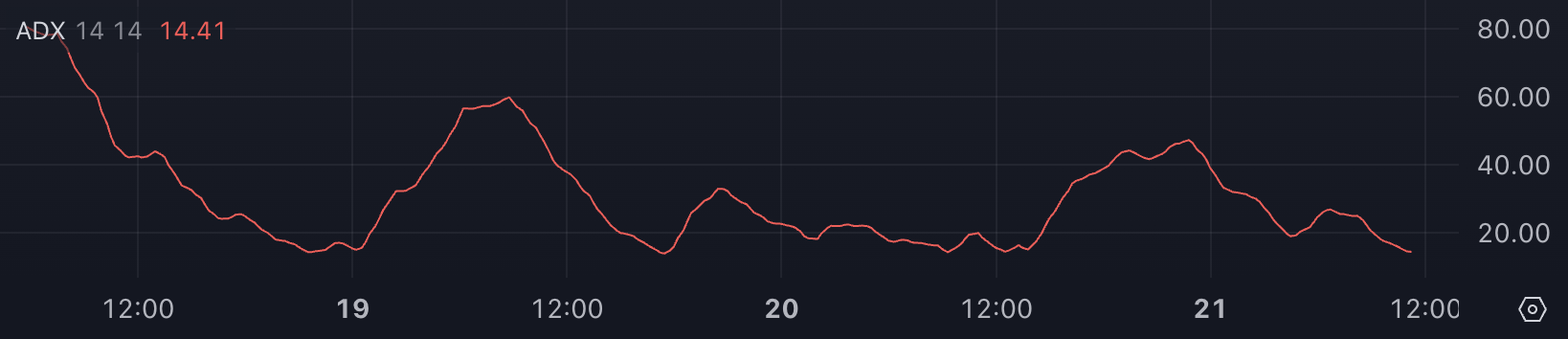 TRUMP ADX on tällä hetkellä 14,4, laskien merkittävästi 46:sta vain eilen. Tämä jyrkkä lasku osoittaa merkittävää trendin heikkenemistä, kun kolikko liikkuu sivuttain ilman selkeää suuntaa.